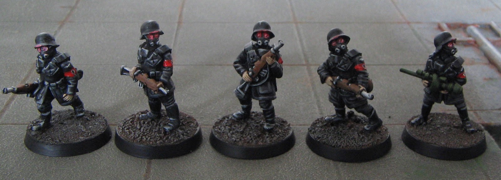 Since I play SotR, I always wanted to do an army based around the Castle Wolfenstein theme. For a start, we have the mad scientist, his bodyguards and a section of SWD garrison. The models can be used for games of Incursion also.